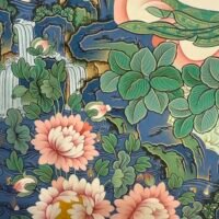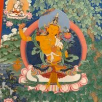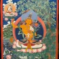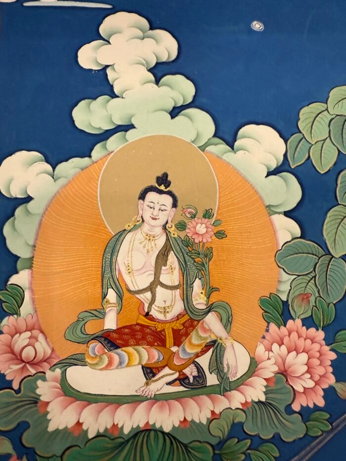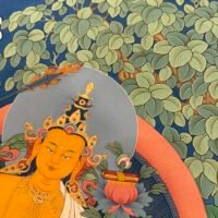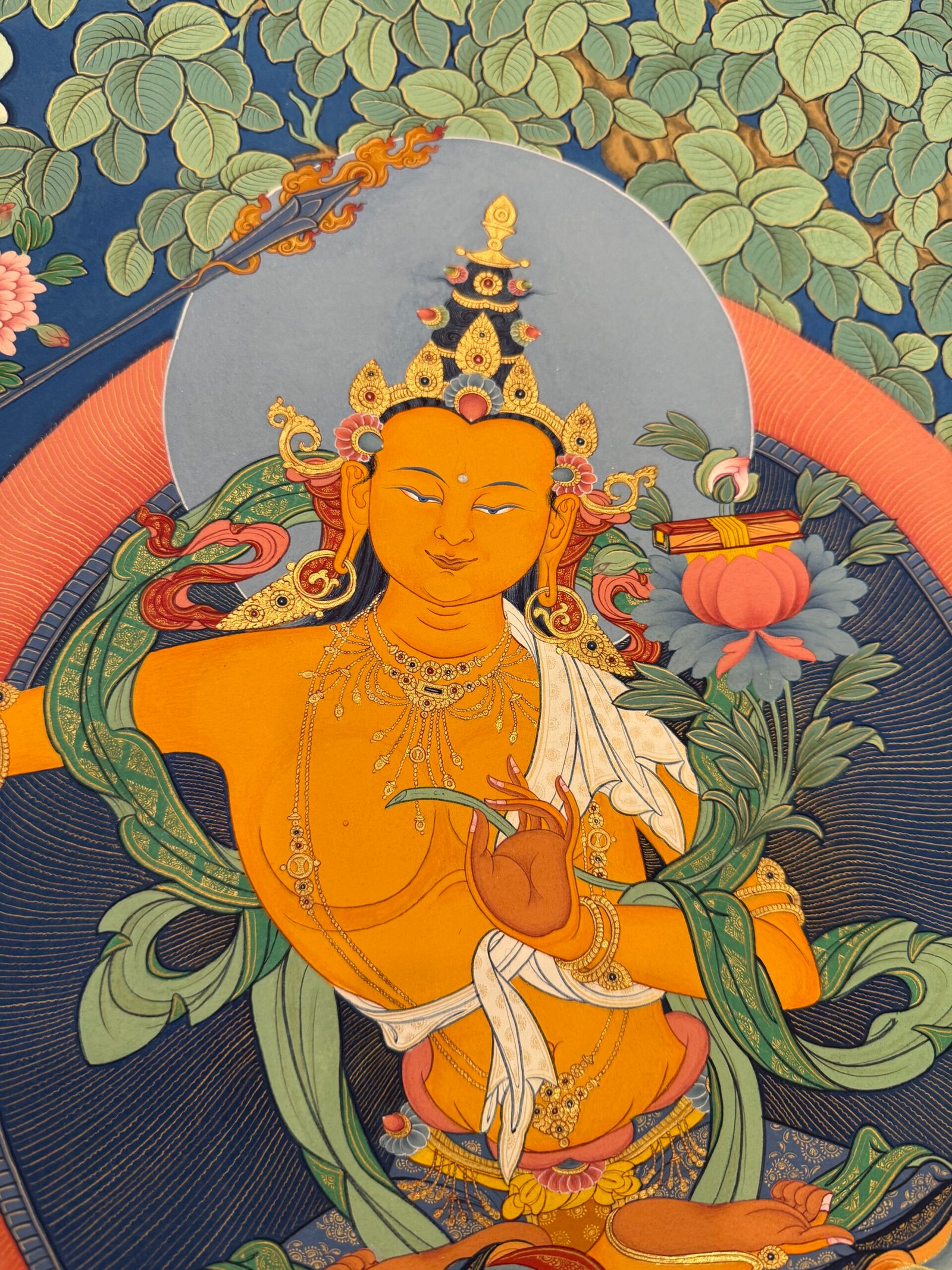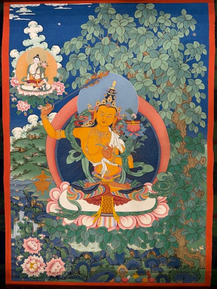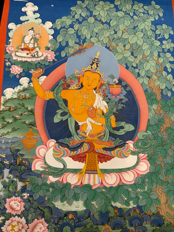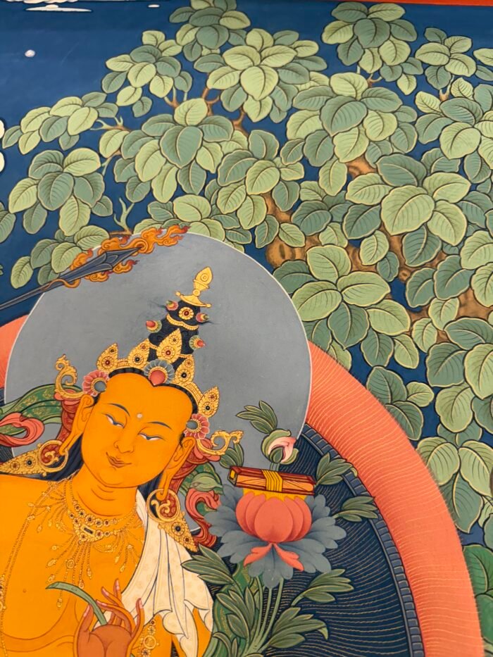This Manjushri Tibetan-style scroll, crafted with devotion by Master Shida, embodies the essence of wisdom and compassion. Seated serenely on a lotus throne, Manjushri’s visage holds both the clarity to perceive the world and the tenderness to care for all beings: his left hand gently cradles the Prajnaparamita Sutra, the fount of wisdom, carrying the vow to guide sentient beings beyond delusion; his right hand raises a wisdom sword, its sharp edge symbolizing the courage to cut through ignorance, yet softening at the brushstroke to reveal compassion for those trapped in confusion.
