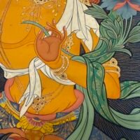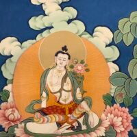 Master Shida’s hand-painted Manjushri Tibetan scroll captures the bodhisattva of wisdom—sword in hand to cut ignorance, sutra in palm to guide. Crafted traditionally with mineral pigments on cotton, framed by carved wooden rollers, it’s portable yet profound. A perfect aid for meditation, and a timeless token of wisdom.