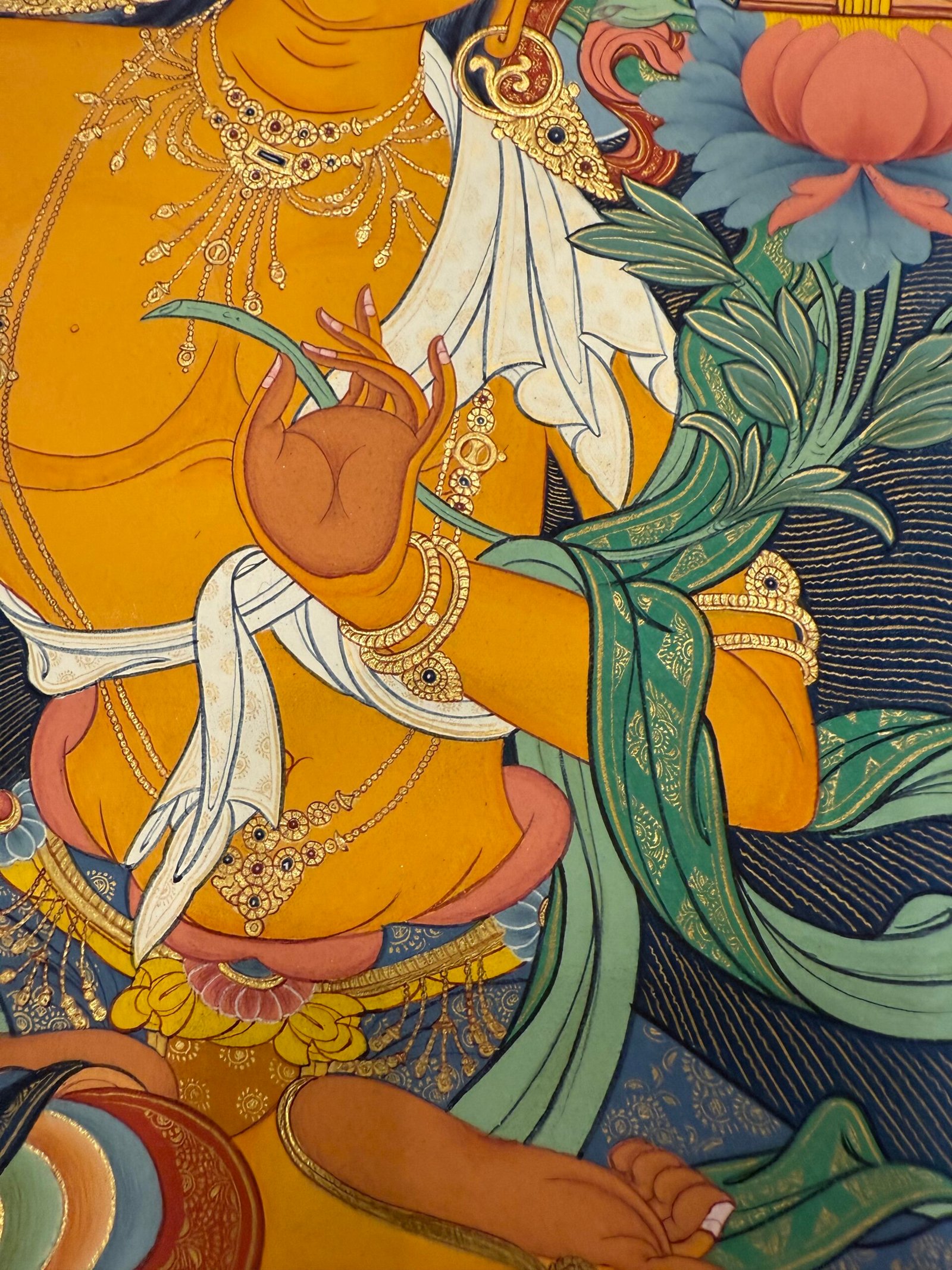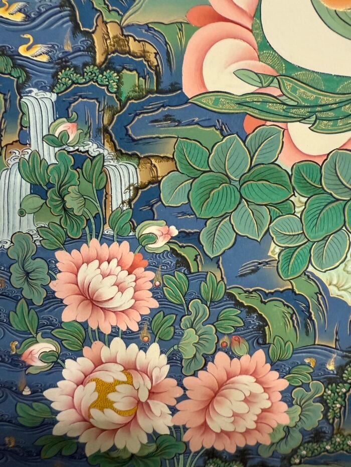 With 40 years of mastery in Tibetan Buddhist art, Master Shida weaves this “union of wisdom and compassion” into every line. His strokes flow like clouds—adhering to the precision of ancient iconometric rules while infusing his own spiritual insights—making Manjushri’s posture not just庄严 (solemn) but approachable, as if gazing directly at anyone seeking guidance.